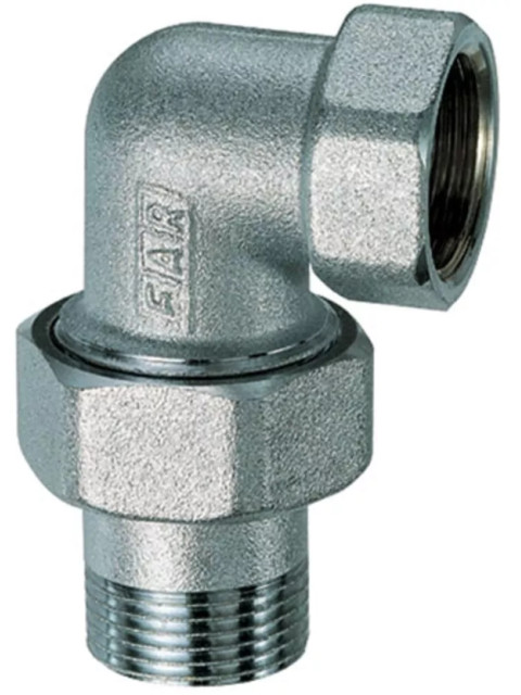 Угловой хромированный разъемный фитинг FAR — соединительный элемент из коррозионностойкой DZR-латуни с хромированным покрытием, предназначенный для герметичного соединения труб под углом 90° в системах отопления, водоснабжения и промышленных установках. Конструкция включает три компонента: два резьбовых патрубка (наружная/внутренняя резьба) и накидную гайку с PTFE-уплотнением (тефлон), обеспечивающим герметичность без дополнительных материалов. Диаметры: 1/2", 3/4".
