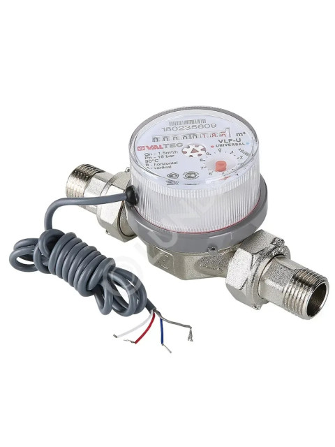 Универсальный водосчетчик Valtec VLF-15U-I предназначен для измерения расхода холодной (+5°C до +40°C) и горячей воды (+40°C до +90°C) в бытовых системах. Условный диаметр — 1/2" (15 мм), монтажная длина — 80 мм. Тип: крыльчатый одноструйный с сухоходным механизмом. Оснащен импульсным выходом для интеграции в системы дистанционного учета (АСКУВ). Резьба присоединения — 3/4" (наружная).