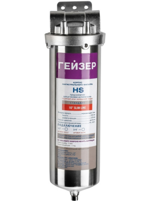 Корпус Гейзер HS 10SL 1/2" рассчитан на работу под давлением, монтируется на входе в систему горячего или холодного водоснабжения квартиру или загородный дом. В зависимости от установленного картриджа может выполнять очистку от механических примесей (ржавчина, окалина, песок и т.д.), хлора и органических соединений, солей жесткости, железа и марганца.