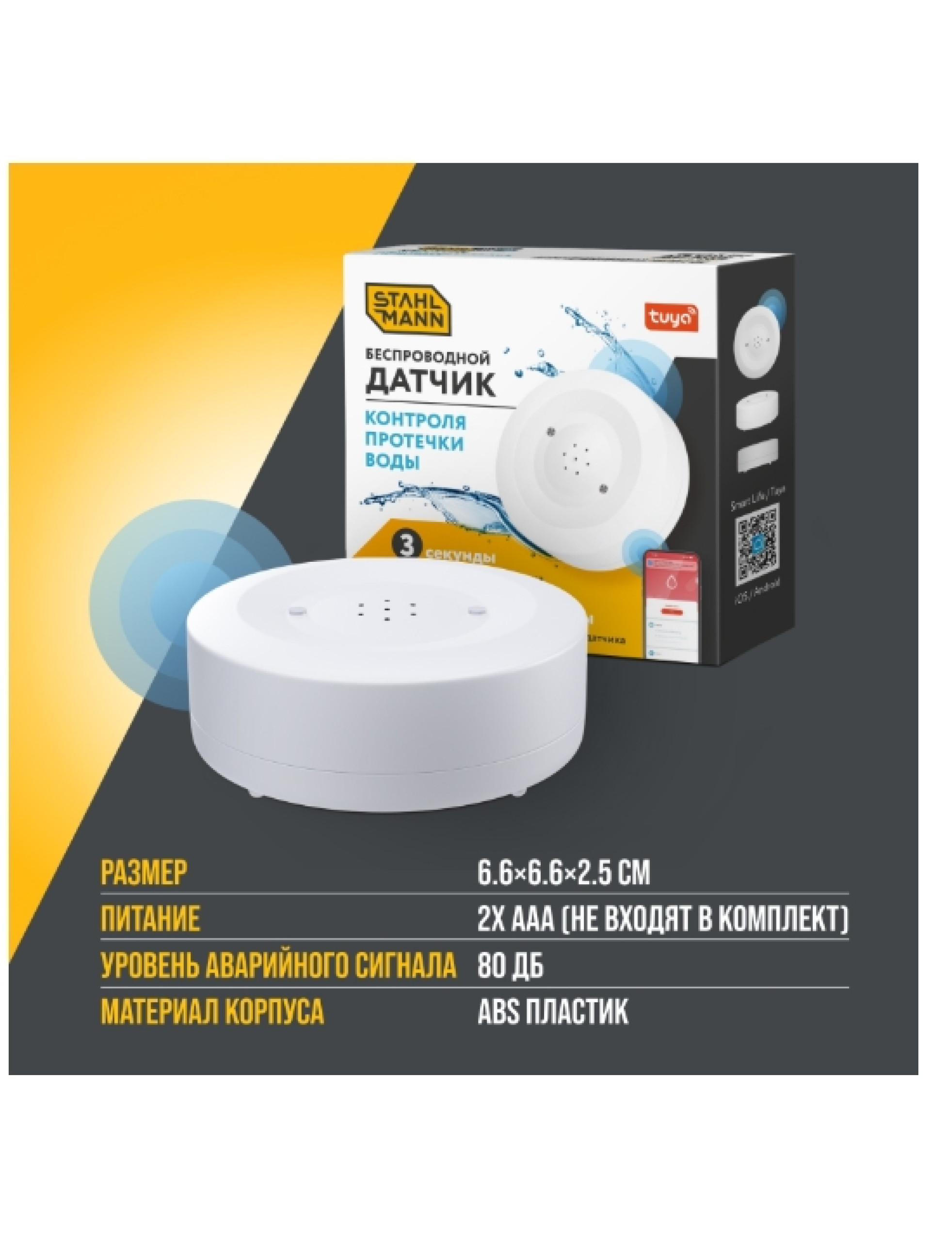 Датчик протечки воды Stahlmann Smart предназначен для фиксации протечки воды и оповещения пользователя посредством звукового сигнала, а также удаленного оповещения в приложении для смартфонов Smart Life (Tuya) в любой точке мира.